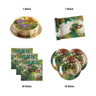 - L: 20x Servietten + 1x Dinosaurier Tortenaufleger + 10x Teller + 1x Tischläufer + 1x Wimpelgirlande + 10x Streudeko